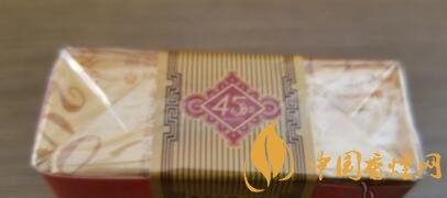 煙封的中間,頂部,變形的中國結(jié)中有45字樣。