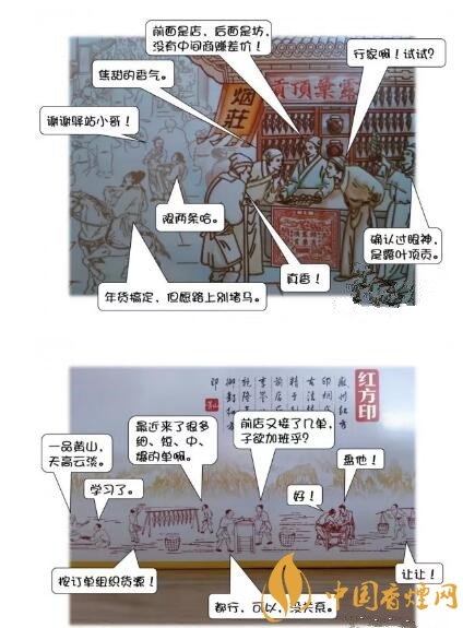 細(xì)看,正面的“前店”是一條古徽州商業(yè)街的圖樣,人頭攢動(dòng)、熙熙攘攘,掛著“露葉頂貢”招牌的紅方印煙莊占據(jù)了C位,門口的“文幫”掌柜手持一片煙葉接受眾人圍觀;背面的“后坊”,則描繪了“武幫”的手工匠人們曬煙、制絲的勞作場景。可惜圖案只能繪色、不能繪聲,假如身臨其境,會聽到什么樣的聲音呢?惡搞一下吧……