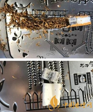 出于好奇,把其中的一根進行了分尸??梢钥吹接袃啥芜^濾嘴,一段加了活性炭,一段就是普通的過濾嘴。