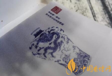 先來欣賞一下煙盒內(nèi)里的包裝設(shè)計(jì)特點(diǎn)。向上掀開合蓋,會(huì)發(fā)現(xiàn)上蓋內(nèi)里印有數(shù)條騰龍圖案,以及china瓷字樣。