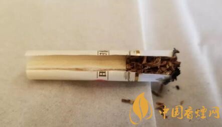 剖開濾嘴,為一段式的醋酸纖維絲束。沒有開降焦孔,絲束顏色淺黃,如此填充緊實(shí)的煙支,很不錯(cuò)!絲束上有條帶狀色深帶,是豎紋盤紙導(dǎo)氣所致。
