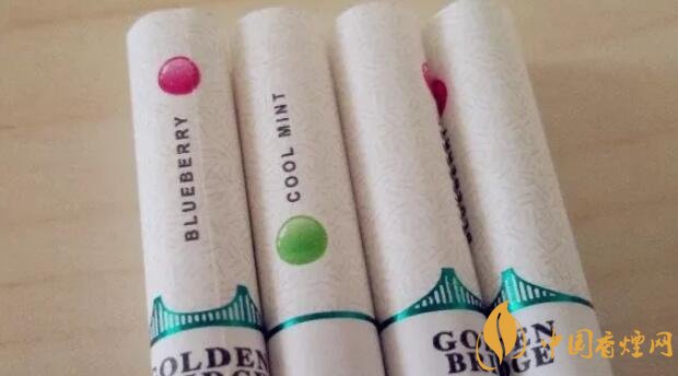 國產(chǎn)爆珠香煙金橋煙支上一道綠箍,一座綠色的金門大橋坐落其上,暗示了這包煙即使不爆珠也自帶的涼味。水松紙上有爆珠示意圖,靠唇端是紫紅色的藍(lán)莓,靠煙絲端是翠綠色的薄荷。又要用圓點(diǎn)顯示爆珠位置,又要用英文字母標(biāo)注爆珠口味,如果同處一側(cè)將顯得擁擠,因此二者分居濾嘴兩側(cè)錯開。煙支上沒有漢字,GOLDEN BRIDGE、BLUEBERRY和COOL MINT,營造出了外煙的既視感。