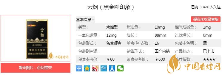 云煙(黑金剛印象)不僅承襲了“云煙”系列產(chǎn)品“清新自然”的風(fēng)格特征,更從產(chǎn)品理念、產(chǎn)品定位、制作工藝上溯到煙葉原材料的種植環(huán)節(jié)。經(jīng)香煙網(wǎng)小編市場調(diào)查云煙(黑金剛印象)售價為60元/包。