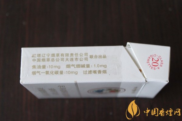 煙盒的右側(cè)注明了理化數(shù)值,標注著由紅塔遼寧煙草和在連公司聯(lián)合出品,焦油量:10mg、煙氣煙堿量:10mg、煙氣一氧化碳量:10mg,三個10的理化數(shù)值,讓人感覺它的協(xié)調(diào)性很好。