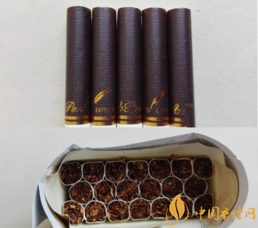 從底部開(kāi)包,煙支呈7-6-7形式排列,泰山壹枝筆香煙煙嘴水松紙呈咖啡色,色彩沉穩(wěn)厚實(shí),其上印有紅色的點(diǎn)狀紋飾,比較雅致,金色的壹枝筆logo和英文名稱環(huán)繞一周,比較奢華。