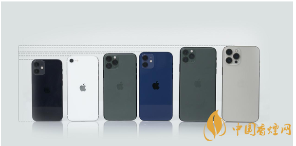 從左至右依次為:iPhone 12 mini、iPhone SE、iPhone 11 Pro、iPhone 12、iPhone 11 Pro Max、iPhone 12 Pro Max