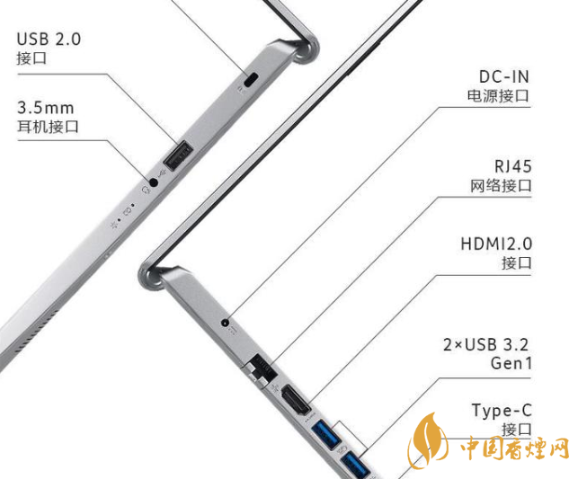 在接口方面,這款筆記本還是比較豐富的,主要的接口有1個(gè)全功能的type-c,2個(gè)usb3.2 Gen1,1個(gè)usb2.0,1個(gè)rj45網(wǎng)線接口,1個(gè)耳麥接口,1個(gè)HDMI2.0,詳細(xì)的接口圖如下: