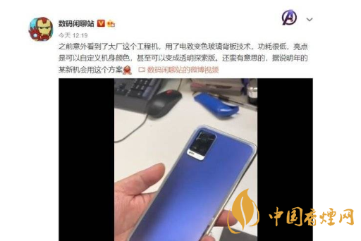 數(shù)碼博主數(shù)碼閑聊站在微博展示了一款可以進(jìn)行機(jī)身自定義變色的手機(jī)。并表示這款新機(jī)采用了電致變色玻璃背板技術(shù),功耗很低,亮點(diǎn)是可以自定義機(jī)身顏色,甚至可以變成透明探索版。