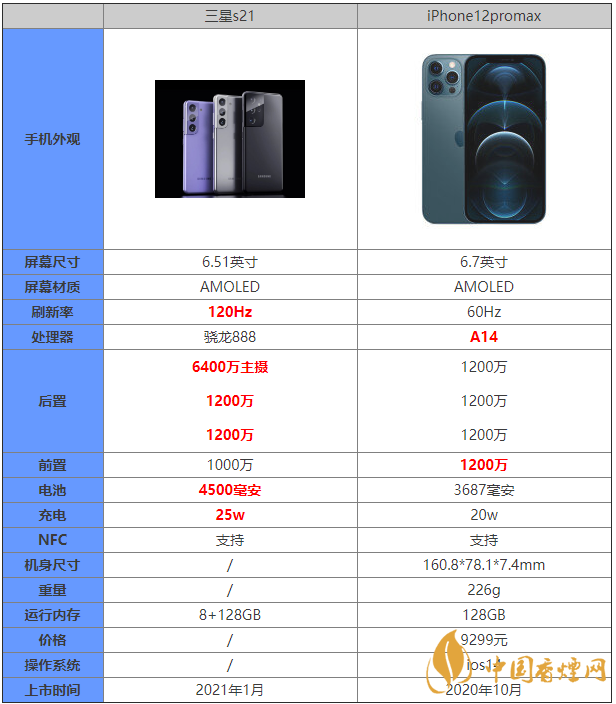 三星s21是一款即將發(fā)布的新款手機(jī),許多小伙伴對(duì)這款手機(jī)一直十分關(guān)注,那么對(duì)比蘋果12promax這款手機(jī)有什么區(qū)別?哪款手機(jī)更值得入手?下面香煙網(wǎng)小編將對(duì)三星s21和蘋果12promax的參數(shù)對(duì)比進(jìn)行介紹,感興趣的朋友一起來(lái)看看吧!