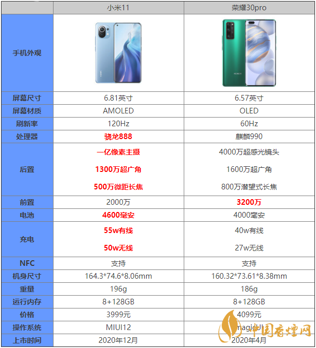 小米11作為今年最強機型,許多小伙伴對這款手機都十分關(guān)注,那么這款手機和榮耀30pro這兩款手機的區(qū)別是什么?哪款手機更值得入手?下面香煙網(wǎng)小編為大家?guī)碜钚碌男∶?1和榮耀30pro參數(shù)對比,感興趣的朋友快來看看吧。