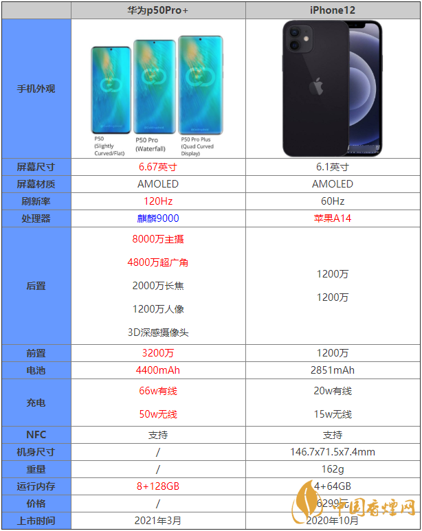 華為p50Pro+是華為將要發(fā)布的新一代旗艦手機(jī),許多朋友對這款手機(jī)都十分的關(guān)注,那么這款手機(jī)和iPhone12哪一個更好,哪款手機(jī)更值得入手?下面香煙網(wǎng)小編將為大家介紹華為p50Pro+和蘋果12參數(shù)對比,感興趣的朋友一起來看看吧