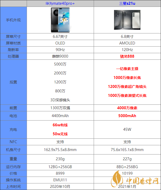 三星s21ultra和華為mate40pro+作為近期新發(fā)手機(jī)中的佼佼者,那么這兩款手機(jī)的區(qū)別是什么?哪款手機(jī)更值得入手?接下來(lái)香煙網(wǎng)小編為大家?guī)?lái)最新的三星s21ultra和華為mate40pro+參數(shù)對(duì)比,快來(lái)看看吧。