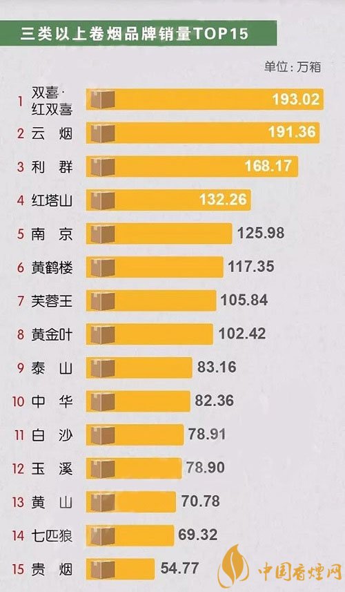三類以上卷煙品牌銷量中,百年香煙品牌雙喜紅雙喜以微弱的優(yōu)勢位居榜首,云煙緊隨其后與排名第三的利群拉開差距。紅塔山、南京、黃鶴樓、芙蓉王、黃金葉分別位居4-8位,銷量也維持在一百萬箱以上,泰山、中華、白沙、玉溪、黃山、七匹狼、貴煙雖然銷量在一百萬箱一下,但都榜上有名,分別占據(jù)9-15位。一直以來,三類卷煙作為全國卷煙市場的中堅(jiān)力量,其市場份額之高、覆蓋面之廣、影響力之深,始終備受行業(yè)內(nèi)外的關(guān)注。