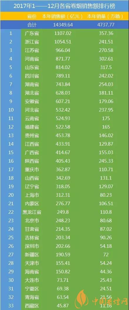 最新中國香煙銷量排行榜前10名 各省香煙銷售額排行榜2017(30省)