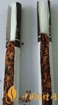 煙支降焦工藝差異比對:真品煙支采用34mm長度的聯(lián)合效益通風(fēng)槽濾嘴,有效降低焦油和一氧化碳量,又充分保留香氣;假煙煙支采用普通單一濾嘴棒,其濾嘴棒長度較短,無法達降低焦油和一氧化碳量理化數(shù)值效果。