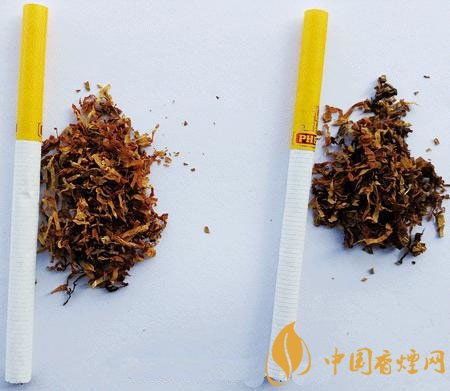 真煙煙支黃色接裝紙長度為30mm,煙絲切絲寬度均勻,煙絲疏松、光澤油潤性好,呈檸檬黃色,煙絲結(jié)構(gòu)為葉絲和少量造紙法再造煙葉;假煙煙支黃色接裝紙較長為32mm,煙絲切絲寬度不勻,光澤油潤性較差,煙絲結(jié)構(gòu)為葉絲和膨脹梗絲,與真品特征存在明顯差異。