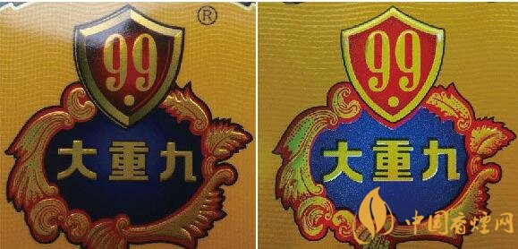 真品小盒商標紙正面印刷工藝以藍色為底燙印“大重九”字樣,邊緣采用精雕細刻雕版燙金技術(shù),套色燙金均勻完整;假煙小盒商標印刷采用“掃描照相”等仿制技術(shù),套色燙金嚴重失真,商標圖案呈現(xiàn)出的效果與真品商標圖案差異明顯。(左真右假)