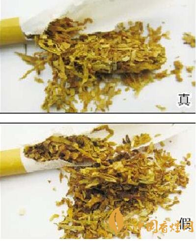 真煙的煙絲呈金黃色(或橙黃色),色澤均勻一致,含煙末少;假煙的煙絲顏色較深,含煙梗及煙末較多,填充性差。