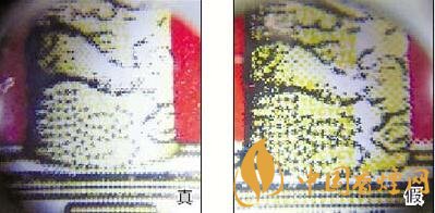 真煙天安門左側華表套色均勻,黃白色分布有明顯分界點,邊緣光滑、干凈、清晰;假煙套色較差,黃白色不明顯,黃色部分印刷較分散,字體邊緣套印有毛渣點,呈現(xiàn)鋸齒狀。