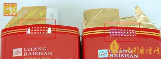 如圖一、圖二白色框標(biāo)注所示,真煙外包裝采用專用紙張印刷,條包和小包圖案及文字顏色一致,顏色光亮、鮮艷,字跡清晰、完整,表面著色均勻、富有光澤,"長(zhǎng)白山"三字凸感明顯。假煙商標(biāo)圖案印刷粗糙、不清晰,文字有偏色、燙金色澤黯淡,字跡不清,表面著色不均,光澤差且模壓圖案或文字凸感不夠。真煙煙盒表面有明顯的豎條紋,假煙則沒有。