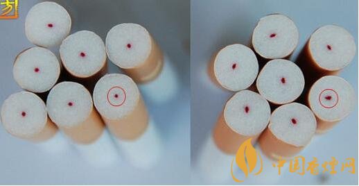 如圖五、圖六紅框標(biāo)注所示,真煙的HCF過濾纖維(俗稱紅線)位于嘴棒中央,側(cè)面呈規(guī)則圓形,假煙則形狀各異參差不齊。有些假煙,中間的紅點(diǎn)是印刷上去的。