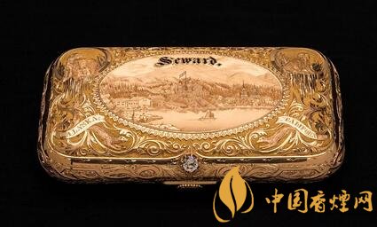 而這款14克拉黃金雪茄盒是1869年由加利福尼亞州先鋒協(xié)會(huì)贈(zèng)送給西沃德。它裝飾著阿拉斯加的景色,包括山脈和沿海城鎮(zhèn),海象,灰熊和獨(dú)木舟美洲原住民狩獵。“阿拉斯加”,“加利福尼亞”和“西沃德”等字樣刻在上面,紀(jì)念西沃德在太平洋沿岸發(fā)展美國領(lǐng)土的作用。