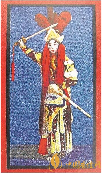 英美煙公司出品的“著名京劇演員劇照”煙畫,70枚一套,其中第28枚為“尚小云之秦良玉”(上圖),為照片版,展現(xiàn)了著名京劇演員尚小云扮演的秦良玉身著戎裝、手持寶劍的形象,背面則印有人名、劇名及演員簡(jiǎn)介。