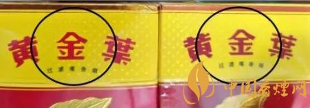 2、正面翻蓋處“黃金葉”文字:真煙“黃金葉”三字立體感強,用手觸摸有凹凸感。假煙字體無立體感,手摸無凹凸觸感。(左真右假)