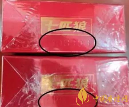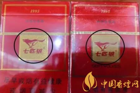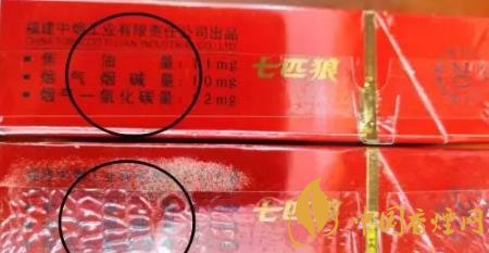 1、商標紙上的“七匹狼”商標圖案:真煙套印準確,燙金飽滿,色澤鮮亮,圖案生動,立體感強。假煙燙金套印容易出現(xiàn)錯位,燙金處會出現(xiàn)漏金現(xiàn)象,顏色相較真煙暗沉,立體感差。(左真右假)