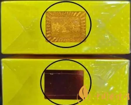 3、原產(chǎn)地標識:真煙筆畫較細,線條清晰,隱約可見五角星、天安門、華表。假煙筆畫較粗,出現(xiàn)線條黏連的現(xiàn)場,五角星、天安門、華表顯現(xiàn)效果差。(左真右假)