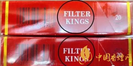 2、側(cè)面英文“FILTER KINGS”:用紫外燈照射真煙“FILTER KINGS”后,移開紫外燈,照射處字體會由黑色逐漸褪色。假煙無此效果,或變色效果差。(上真下假)