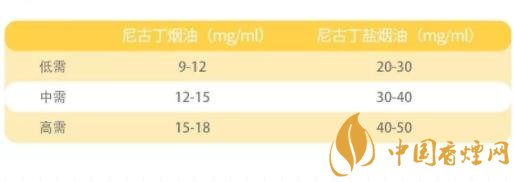同理,標(biāo)注為50mg的煙油中尼古丁含量約等于5%。由此可得,1mg/ml=10*1%,即煙油上標(biāo)記的“Nmg”(N為數(shù)字),除以10可得出百分比含量。