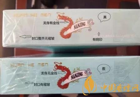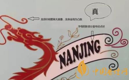 看條盒顏色,真煙為淡藍(lán)色,顏色柔和純正;假煙為淺藍(lán)色,視覺上顏色不是自然色。看條盒圖標(biāo),真煙“南京”二字字體端正清晰,龍須印刷圖案無重疊,龍身金線為凸版,條盒金邊無毛刺;假煙“南京”二字字體向左微傾,龍須有疊痕錯(cuò)層,龍身顏色為褐紅色、金線為凹版,條盒金邊有毛刺。