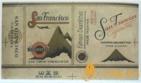 上世紀三十年代,由利群煙廠出品的“舊金山”牌卷煙,為橫版。煙標上由紅色大寫英文字母“S”帶出的“San Francisco”品名,舞動感十足。其下兩座金山上,一架飛機翔過,山腳旁畫有三個重疊的紅色圓圈,一圈一圈又一圈,像極了煙蒂的火苗生生不息,在此中間寫有“CIGARETTES”,別出心裁地交代了“舊金山”牌卷煙的品質和規(guī)格。副版的文字多于圖案,草寫的英文煙標,重復豎寫橫寫的“Famous cigarette”,左上角“注意封口、謹防假冒”八個中文字的提示,卻很醒目。當時的煙標設計,以提示的文字顯現(xiàn),確不多見。整張煙標幾乎鋪滿了“舊金山”牌卷煙所要表達的內容。