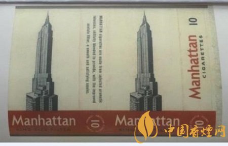 上世紀四十年代,美國煙公司出品了“曼哈頓”牌香煙,為10支裝規(guī)格。正版與副版均畫有曼哈頓的標注性建筑——帝國大廈。帝國大廈建于1931年4月,是紐約的地標建筑物之一。它高381米,共有103層。它是一座多功能寫字樓,也是旅游景點。上世紀四十年代,帝國大廈是全球最高的大廈,后被世貿雙子塔取代。世貿雙子塔被毀后,帝國大廈重又成為最高大廈。煙標底部紅色實心框內,寫有粗體英文“Manhattan”煙標名稱,騎縫處寫有三行曼哈頓香煙的產品介紹。整張煙標,巍峨雄偉的銀灰色帝國大廈,在正副版上遙相呼應,嘆為觀止。