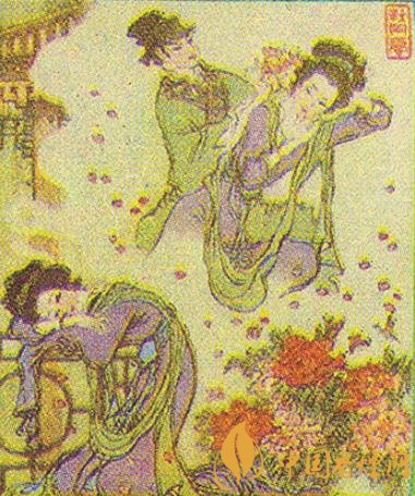 第三枚為“驚夢(mèng)”,展現(xiàn)了杜麗娘的夢(mèng)境:在牡丹盛開的涼亭下,柳生正將一朵艷麗的牡丹插戴在她的鬢間;第四枚為“寫真”,展現(xiàn)的是杜麗娘作自畫像的情景;第五枚為“婚走”,描繪的是柳生扶起起死回生的杜麗娘一起回家的一幕,極具浪漫主義色彩。