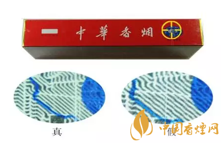 “中華”原產(chǎn)地標(biāo)志為藍色橢圓形,折光可見“中華”字樣、8顆“★”及天安門圖案。真煙色彩飽滿,圖案清晰;假煙色彩暗淡,圖案模糊。同時還可以借助圖中藍色線的走勢來區(qū)分真假煙。