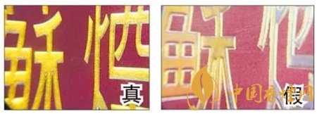 真煙:標簽紙用色均勻,且濃而鮮艷。假煙:標簽紙粗糙,色彩不均,有些地方甚至沒有上色。