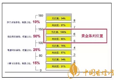 在同一組貨架上,因?yàn)轭櫩妥⒁暤姆绞讲煌圆煌惲形恢卯a(chǎn)生的銷量會(huì)有不同的變化,一般來說,與視線平齊的位置陳列的商品銷量最高,而顧客需要仰望和蹲下才能注視的商品銷量相對(duì)要低。