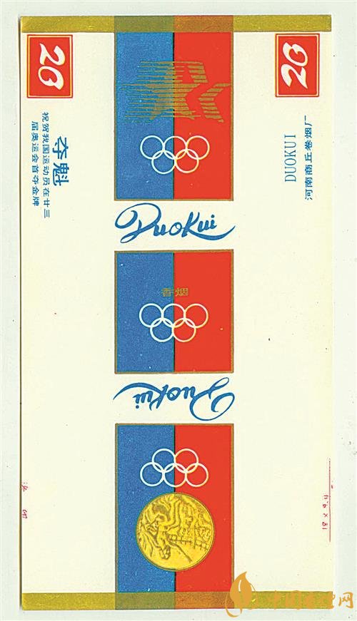 1984年,在美國洛杉磯舉行的第23屆夏季奧運會上,我國射擊運動員許海峰實現(xiàn)了我國奧運金牌零的突破。為祝賀我國運動員取得好成績,上世紀80年代,河南商丘卷煙廠出品了多個版本的“奪魁”煙標。其中一個版本的“奪魁”煙標(圖①),圖案采用紅色、藍色和金色為主要配色,主版圖案為洛杉磯奧運會會徽,左側(cè)位置印有“祝賀我國運動員在廿三屆奧運會首奪金牌”字樣,副版上印有奧運會金牌圖案和奧運五環(huán)標志。同時期,山東兗州卷煙廠出品了“五洲”煙標,主、副版圖案分別為第23屆夏季奧運會會徽和奧運五環(huán)標志。