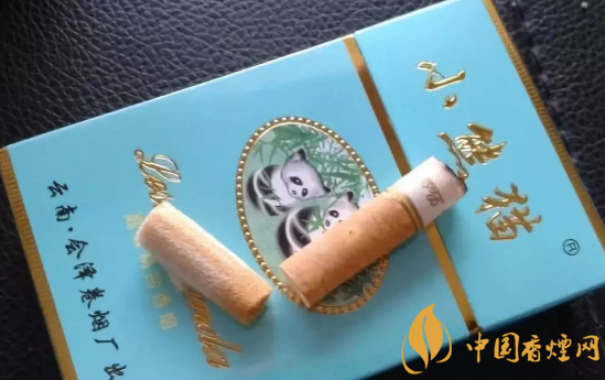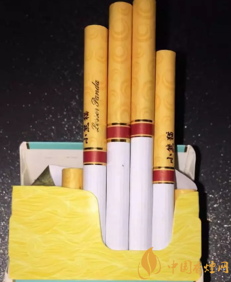 拉出煙支,過(guò)濾嘴看起來(lái)頗為精致,過(guò)濾嘴紙質(zhì)的顏色淺黃,上邊還印著一圈一圈的圖樣,濾嘴與煙支連接處是一圈較粗的紅色絲帶,每支煙支的濾嘴上都印著小熊貓的中英文字樣。