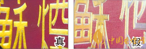 真煙燙金字體線條清晰、不漏金,金色部分成色純正;假煙燙金字體線條不清晰,有漏金現(xiàn)象,金色部分成色暗淡。