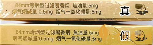 4.小盒側面燙封和拉線頭差異對比:真品卷煙采用機器燙封一次成型,封口較平整,拉線頭較寬且為規(guī)則的半橢圓形,“煙氣煙堿量”等文字筆畫均較粗;假煙拉線頭較窄且形狀不太規(guī)則,“煙氣煙堿量”等文字筆畫均較細。