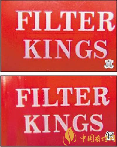 2.小盒側(cè)邊“FILTER KINGS”白色英文字防偽效果對比:用紫外燈照射其3到5秒鐘,真煙照射處的白色字會變成紫紅色,關掉紫外燈等幾秒鐘后,變色處會恢復為原先的白色,且白色字體邊緣光滑、表面干凈;假煙的防偽變化效果較差,字體邊緣有毛渣和印刷留下來的污點。