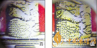 1.小盒正面商標紙?zhí)咨珷C金工藝對比:真煙天安門左側(cè)華表套色均勻,黃白色分布有明顯分界點,邊緣光滑、干凈、清晰;假煙套色較差,黃白色不明顯,黃色部分印刷較分散,字體邊緣套印有毛渣點,呈現(xiàn)鋸齒狀。