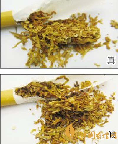 5.煙絲結(jié)構(gòu)及成色差異對比:真煙的煙絲呈金黃色(或橙黃色),色澤均勻一致,含煙末少;假煙的煙絲顏色較深,含煙梗及煙末較多,填充性差。