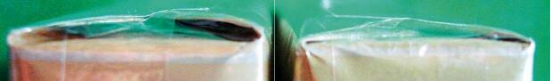 2.看小盒底部包裝紙,真煙包裝紙折角處呈現(xiàn)弧狀,且間隙較大;而假煙的底部包裝紙折角處呈銳角,而且間隙比較小。肉眼可直接對(duì)比出來。