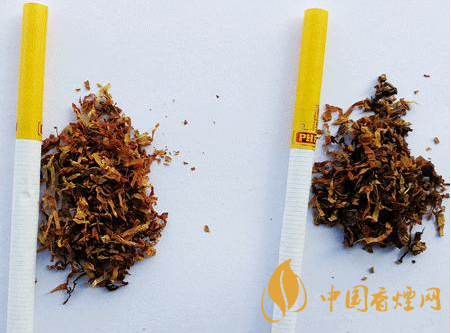 煙支及煙絲差異對(duì)比:真煙煙支黃色接裝紙長度為30mm,煙絲切絲寬度均勻,煙絲疏松、光澤油潤性好,呈檸檬黃色,煙絲結(jié)構(gòu)為葉絲和少量造紙法再造煙葉;假煙煙支黃色接裝紙較長為32mm,煙絲切絲寬度不勻,光澤油潤性較差,煙絲結(jié)構(gòu)為葉絲和膨脹梗絲,與真品特征存在明顯差異。