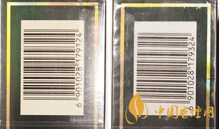 煙用包裝膜材質及條形碼對比:真品卷煙條包裝膜材質光滑,均勻無皺褶,條形碼區(qū)域呈淡黃色,套色均勻清楚。假煙條包裝膜材質粗糙,有不均勻皺褶,條形碼區(qū)域為白色,套色邊緣放大后模糊不清。
