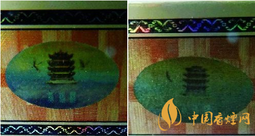 小盒商標(biāo)紙側(cè)邊雙重全息定位燙技術(shù)差異比對(duì):真品小盒側(cè)邊雙重全息定位燙技術(shù)的圖案由黃鶴樓實(shí)景照及黃鶴樓三個(gè)燙金字組合,切換不同角度會(huì)呈現(xiàn)出清晰較高全景圖案;假煙定位燙圖案多采用照相等仿造技術(shù),無論如何切換不同角度都不能完整性呈現(xiàn)清晰圖案,與真品呈現(xiàn)效果差異明顯。